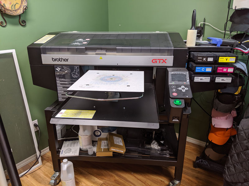 We use the Latest technology in direct to garment printing - the Brother GTX - which uses True Black, 3 colours plus white to match any colour imaginable with photo quality. Images are applied to the fabric similar to the way an inject printer prints to paper. Inks are specially formulated to resist fading from light and washing and wont crack or peel like iron on transfers or silk screen printing will.